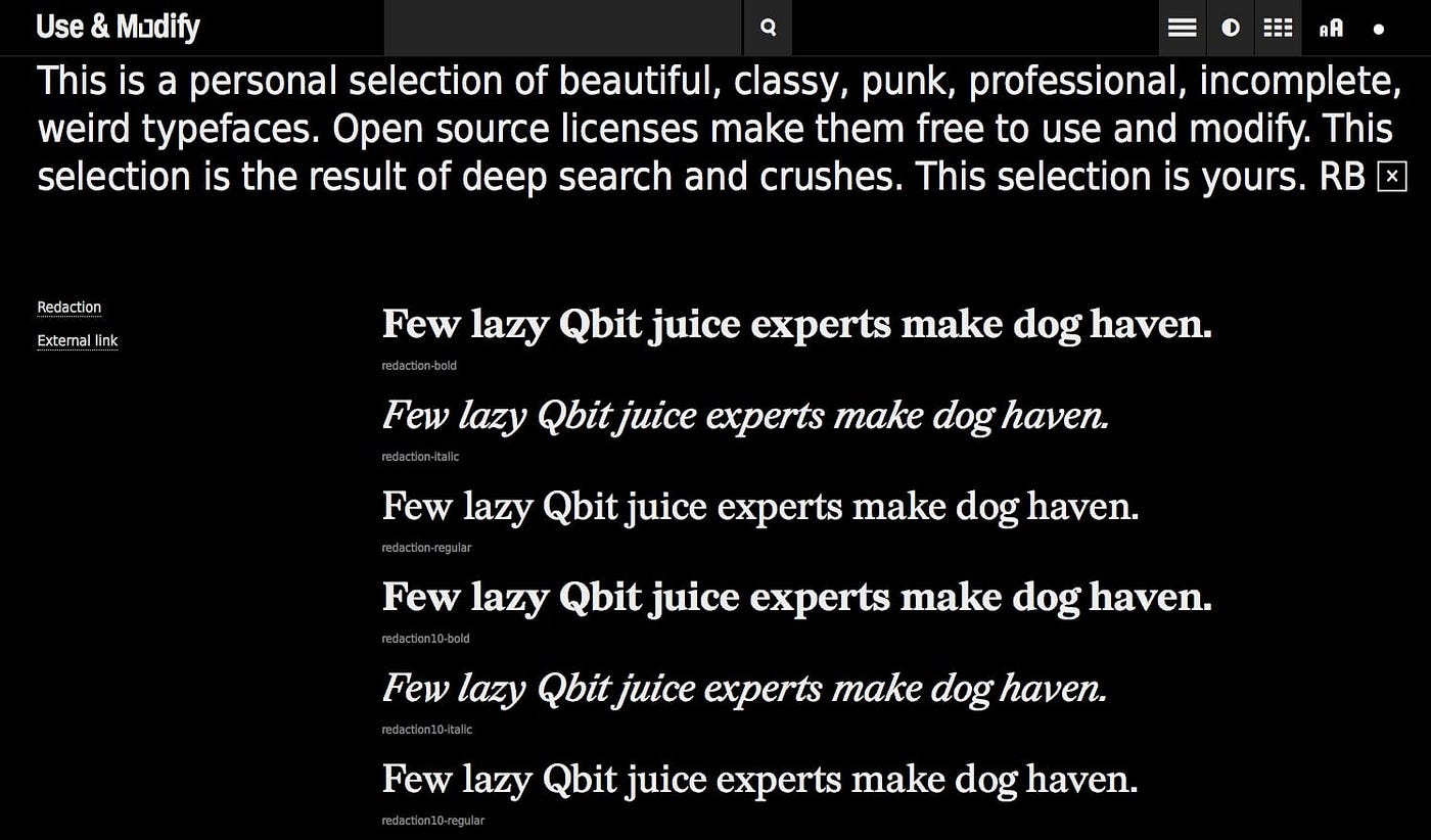 Теперь эти шрифты полностью бесплатны. Uncut WTF - отличный сайт, он имеет более 100 шрифтов, и вы можете прокручивать различные категории, такие как Sans Serif, Serif, Monospace и Display. Когда вы нажимаете на шрифт, вы можете увидеть его данные лицензии (открыть лицензию на шрифт), которые позволяют использовать его для коммерческих проектов, изменить его и даже перераспределить. Просто нажмите «Информация» или «Скачать» и перейдите к источнику, будь то GitHub или другой сайт.