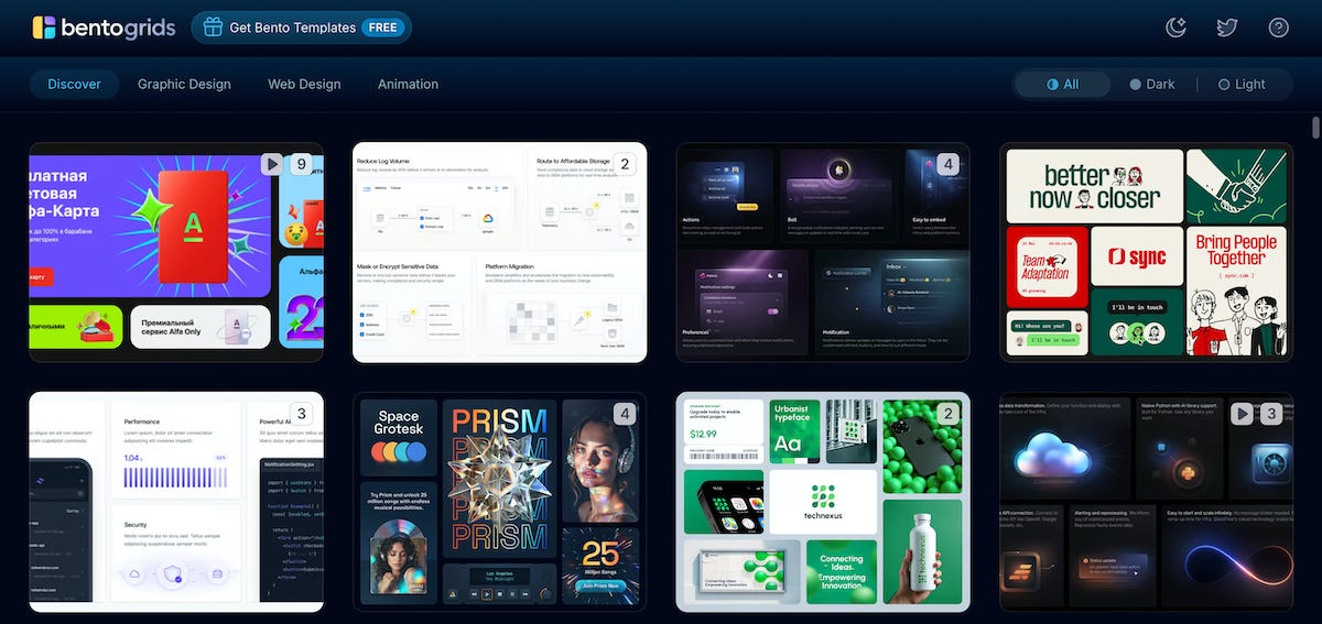Моя первая, которую я люблю, это бенто -сетки. Теперь вы видели эту тенденцию, все занимались сетками Bento. Это просто отличный способ показать личность вашего бренда или веб -дизайн. Вы можете поместить его в социальные сети, Instagram или LinkedIn. У него есть куча бенто, которые вы можете использовать для вдохновения.